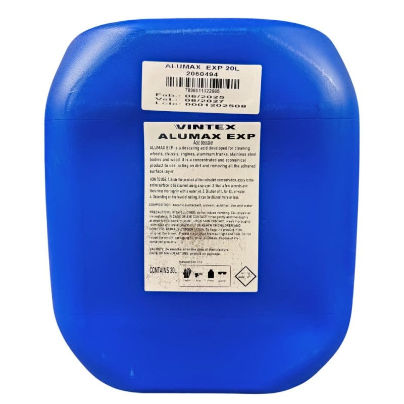Alumax 20 litros es un desincrustante de carácter ACIDO, desarrollado para la limpieza de llantas, chasis, motores, compartimientos de aluminio, carrocerías de acero inoxidable y madera. Es un producto concentrado y económico en su uso, actuando sobre la suciedad y eliminando toda la capa superficial adherida. – Concentrado – Alto rendimiento